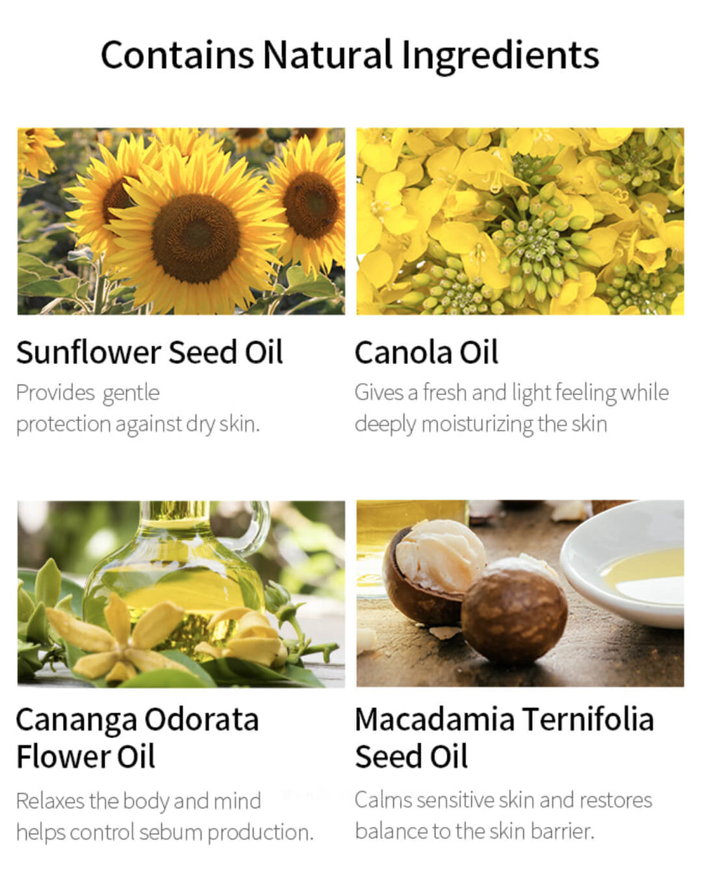 Helianthus Annuus (Sunflower) Seed Oil, Canola Oil, Sorbeth-30 Tetraoleate, Calendula Officinalis Flower Extract, Simmondsia Chinensis (Jojoba) Seed Oil, Macadamia Ternifolia Seed Oil, Cananga Odorata Flower Oil, Sorbitan Sesquioleate