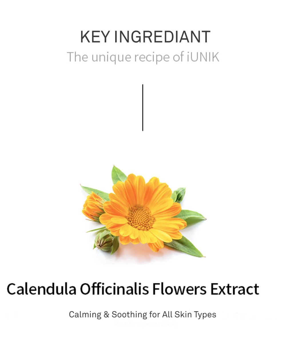 <p><strong>Calendula Officinalis Flower Extract</strong> — The star ingredient and namesake of this formula. Derived from the Marigold plant, calendula has been used in traditional medicine across Asia and Europe for centuries for its remarkable healing and soothing abilities. Rich in flavonoids, it delivers potent antioxidant and anti-inflammatory benefits, calms sensitivity and redness, eliminates bacteria on the skin's surface, and helps stimulate collagen production for improved firmness and elasticity over time.</p>